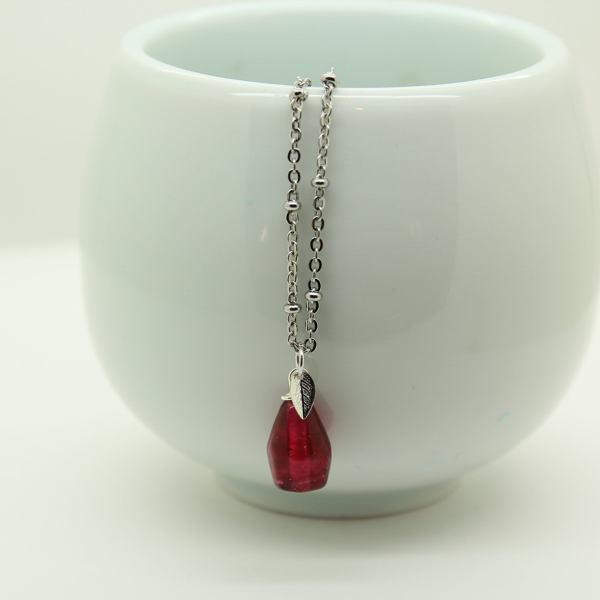 Glass & Brass. The chain is made of stainless steel. Stones inside the pomegranate are jade stones.