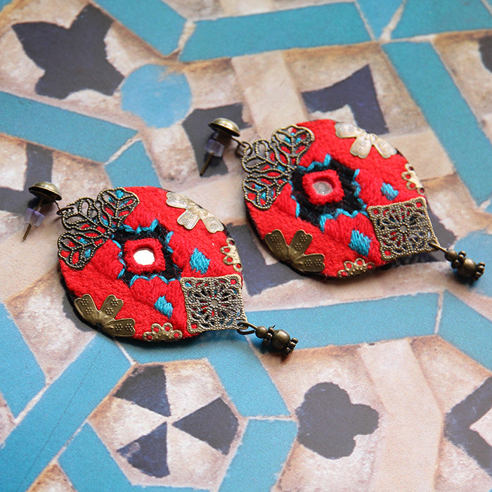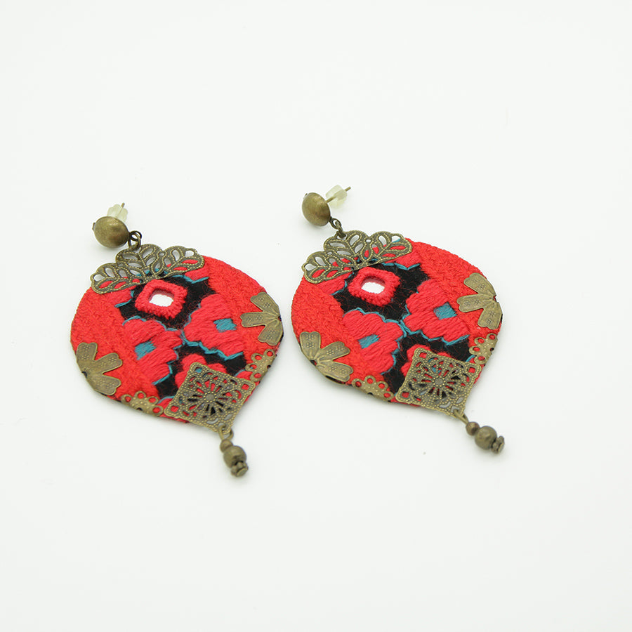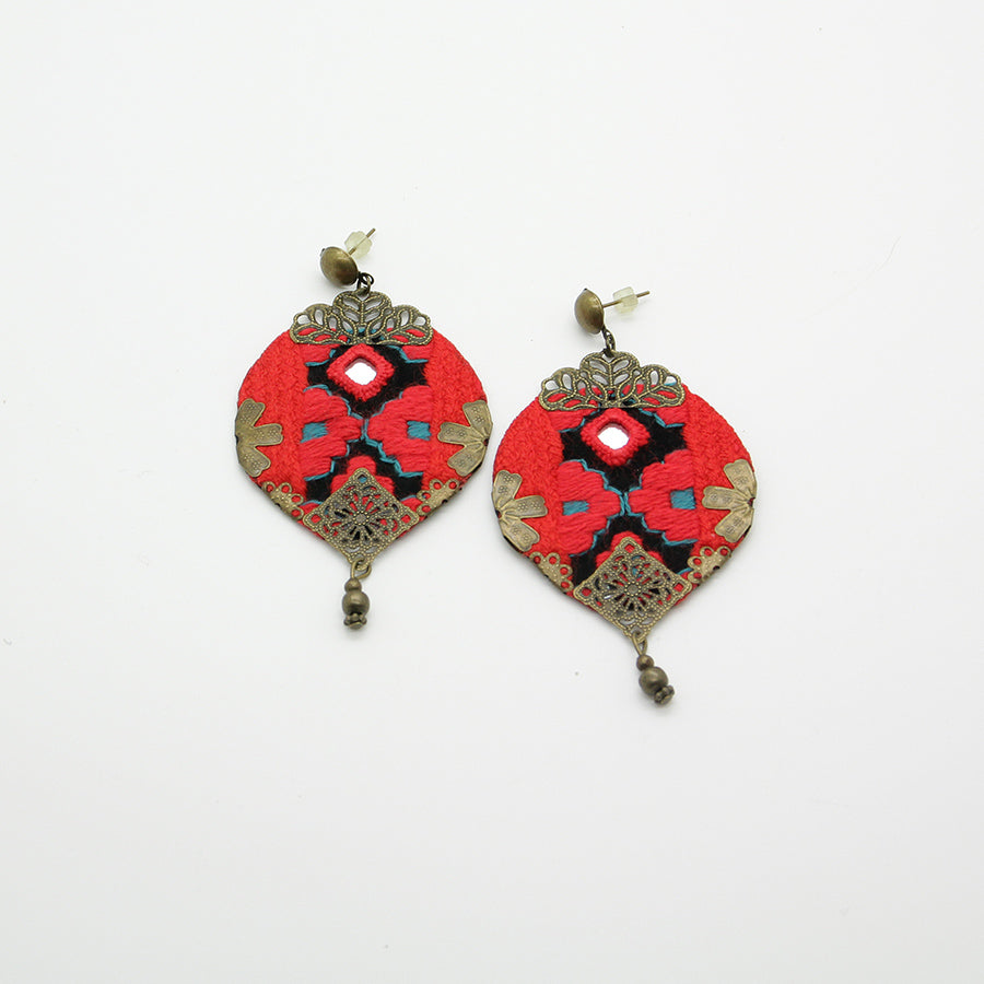 The earrings are hand made needle work with 100% natural thread, all environmentally friendly material (100% cotton and brass, NO plastic) for people that we share our concern about environment with. One item takes days and days of needlework. The artistic patterns inspired from the Persian heritage adds to warmth to your style.