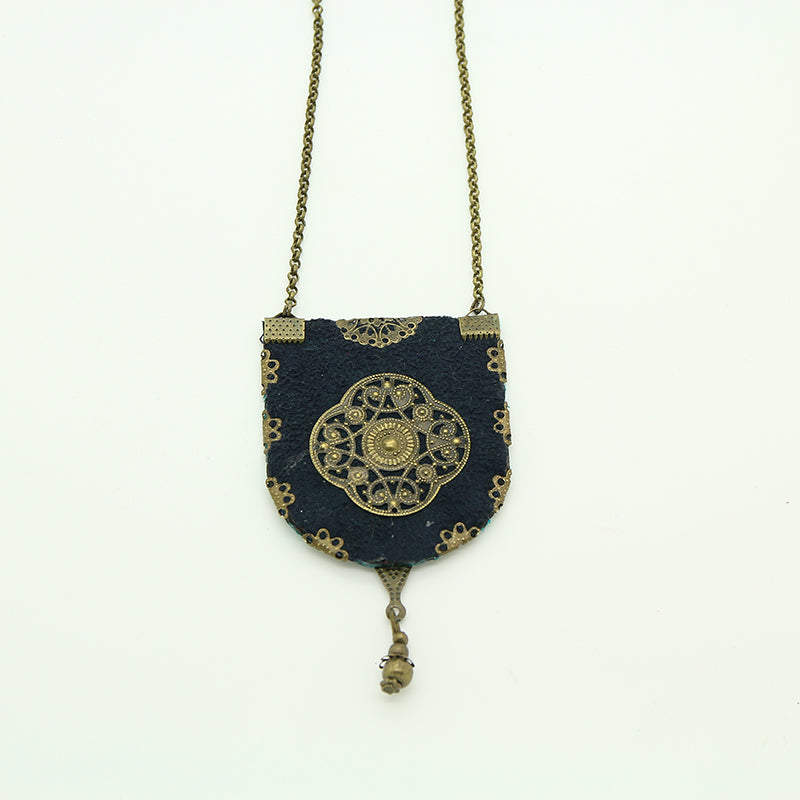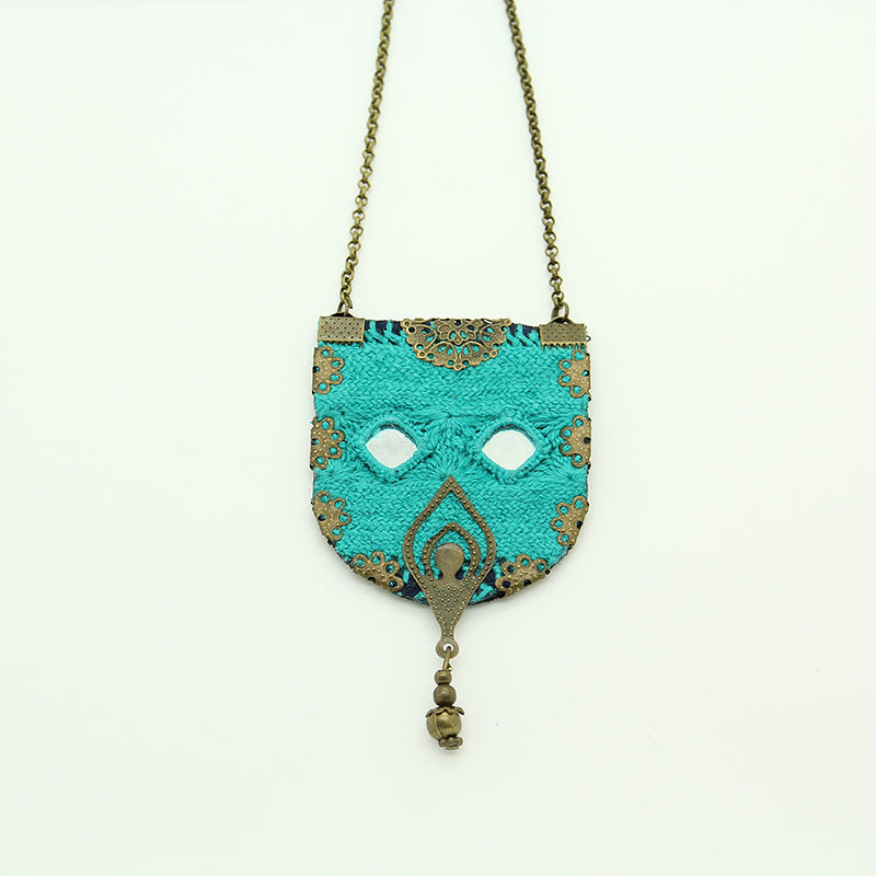 The necklace is hand made needle work with 100% natural thread, all environmentally friendly material (100% cotton and brass, NO plastic) for people that we share our concern about environment with. One item takes days and days of needlework. The artistic patterns inspired from the Persian heritage adds to warmth to your style.