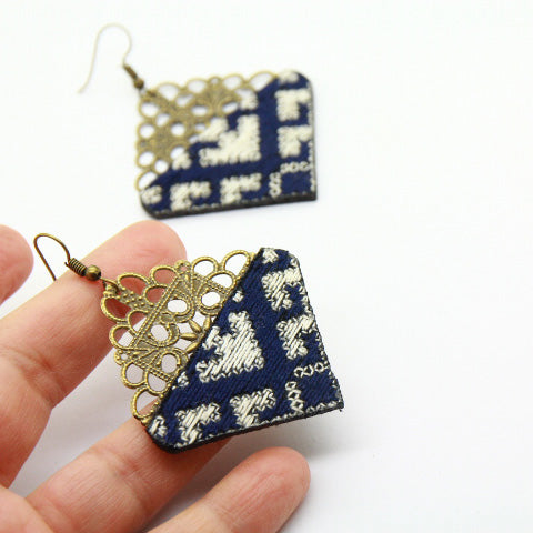 The earrings are hand made needle work with 100% natural thread, all environmentally friendly material (100% cotton and brass, NO plastic) for people that we share our concern about environment with. One item takes days and days of needlework. The artistic patterns inspired from the Persian heritage adds to warmth to your style.