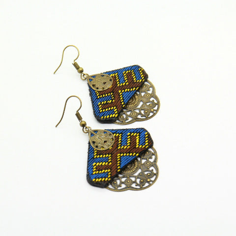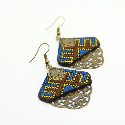 The earrings are hand made needle work with 100% natural thread, all environmentally friendly material (100% cotton and brass, NO plastic) for people that we share our concern about environment with. One item takes days and days of needlework. The artistic patterns inspired from the Persian heritage adds to warmth to your style.