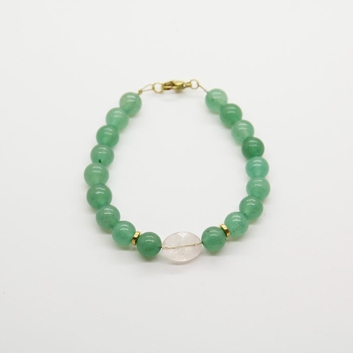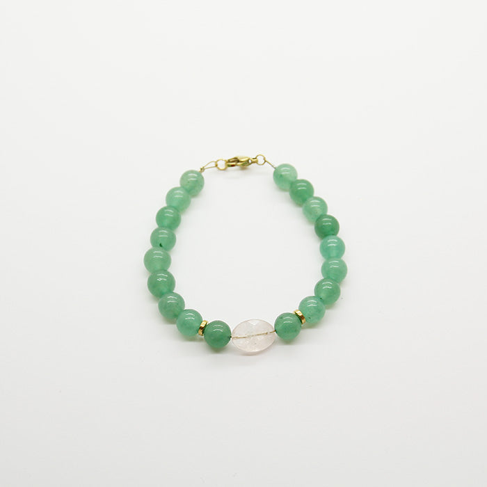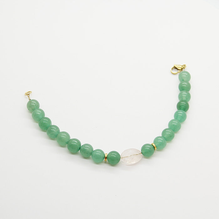 The smooth, polished beads and stones feel cool and comforting against the skin, and the simple yet elegant design makes it perfect for everyday wear. The gentle energy of the rose quartz is said to promote love and harmony, while the green beads represent growth and renewal. Together, they create a bracelet that is both beautiful and meaningful, and a lovely reminder to take a moment to pause and appreciate the simple joys in life.